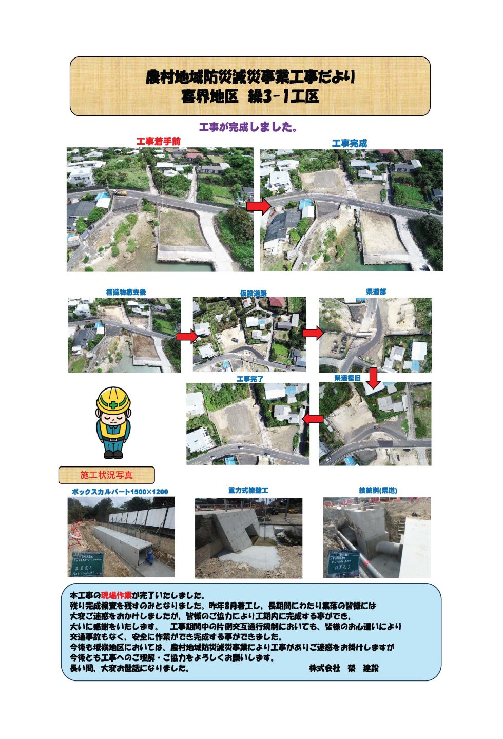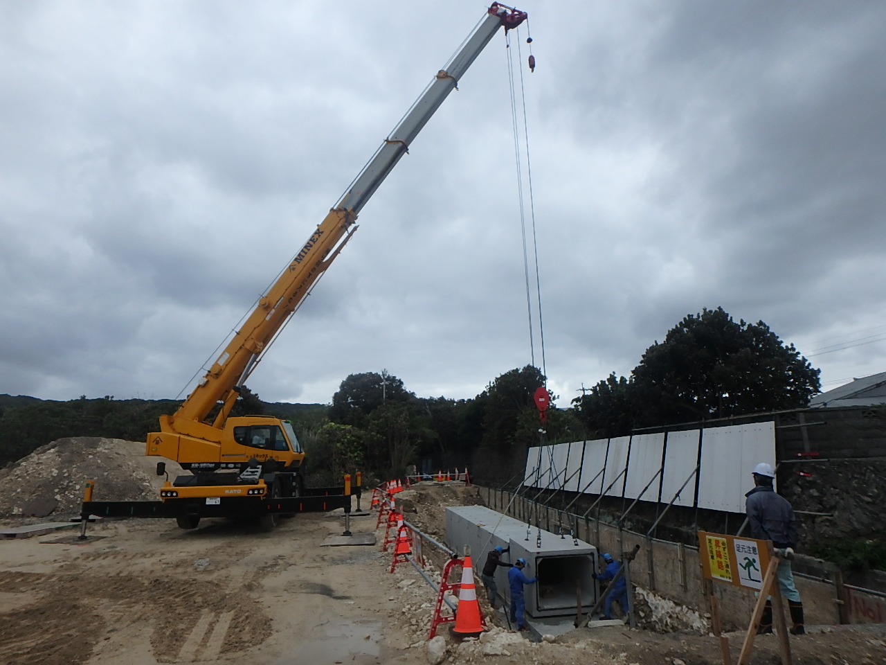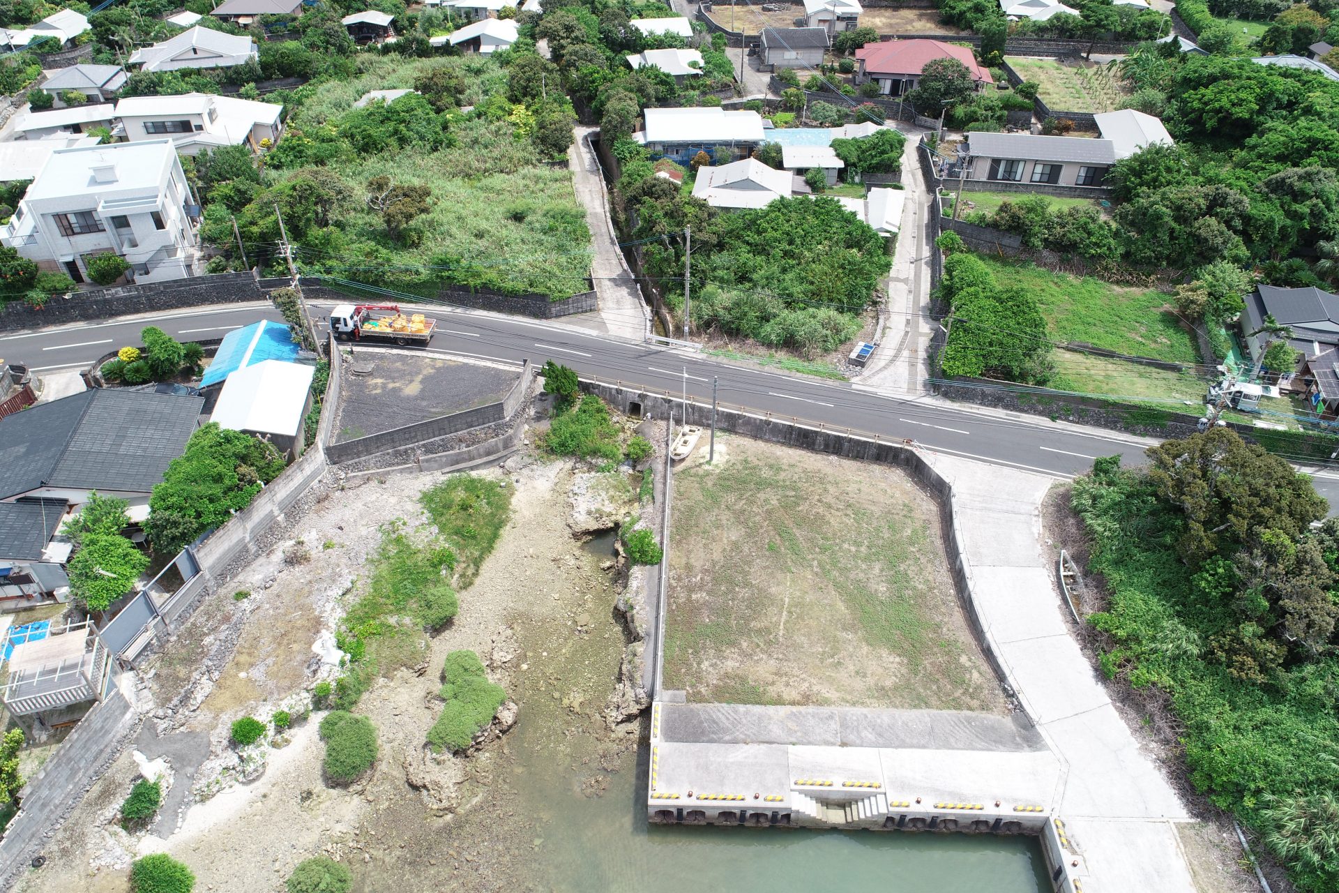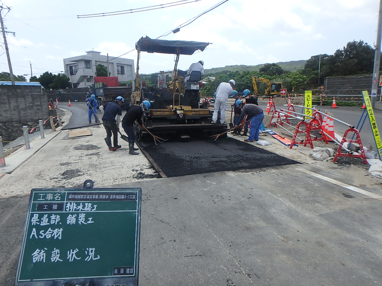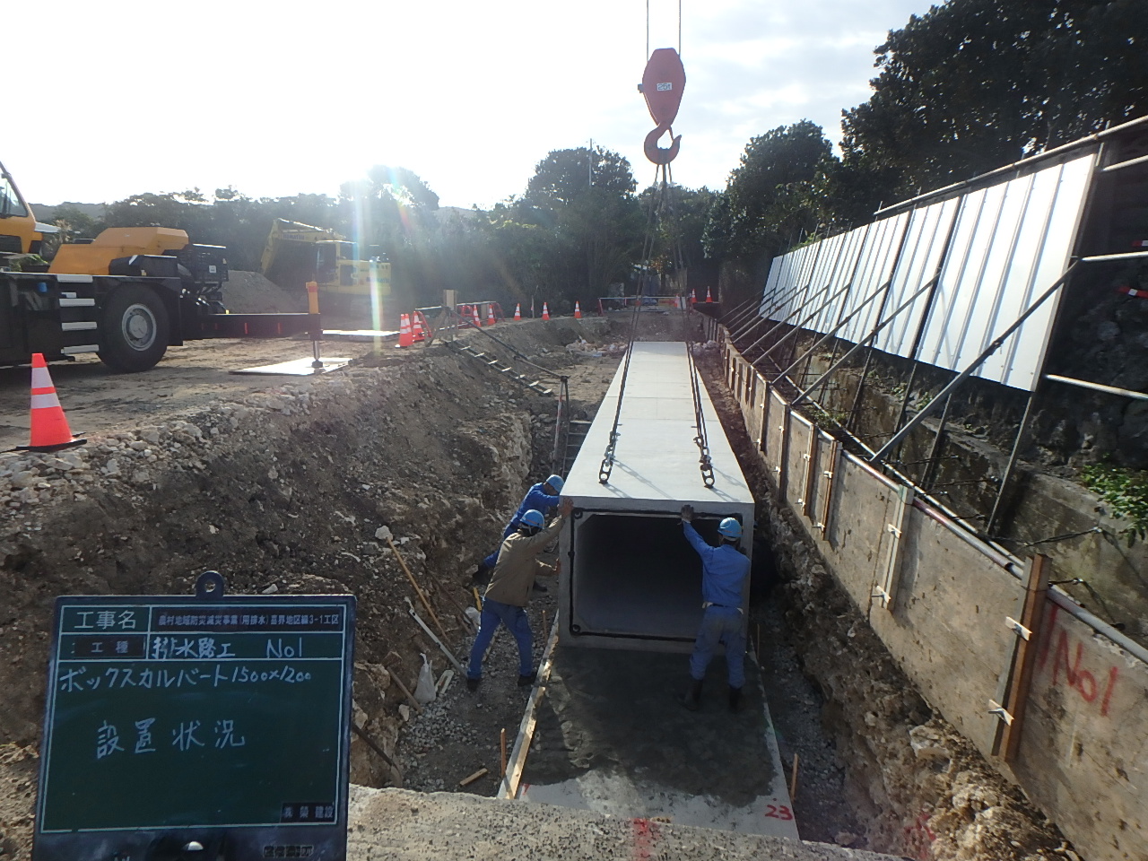 集中豪雨により流出した土砂が蓄積し、既存水路からの越水が発生し家屋等への浸水が懸念され、今後の災害を防止する為新設排水路を集落内から海側に向けて工事の施工を行いました。